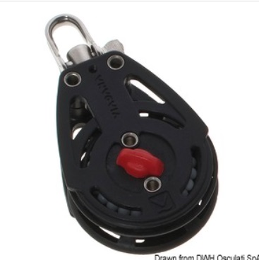 Con bolas de material compuesto + carraca. Polea Ø 57 mm, hoja max Ø 10 mm, carga de rotura 900 kg, carga de trabajo 205 kg.